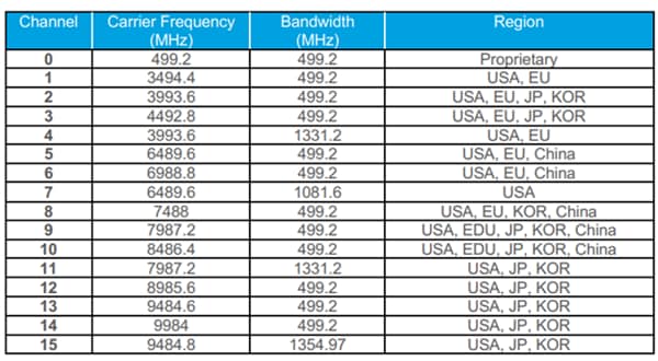 Figure 1: UWB Channels and their use in different global regions. (Source: Qorvo)