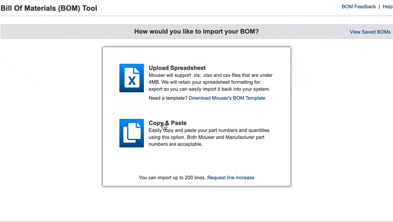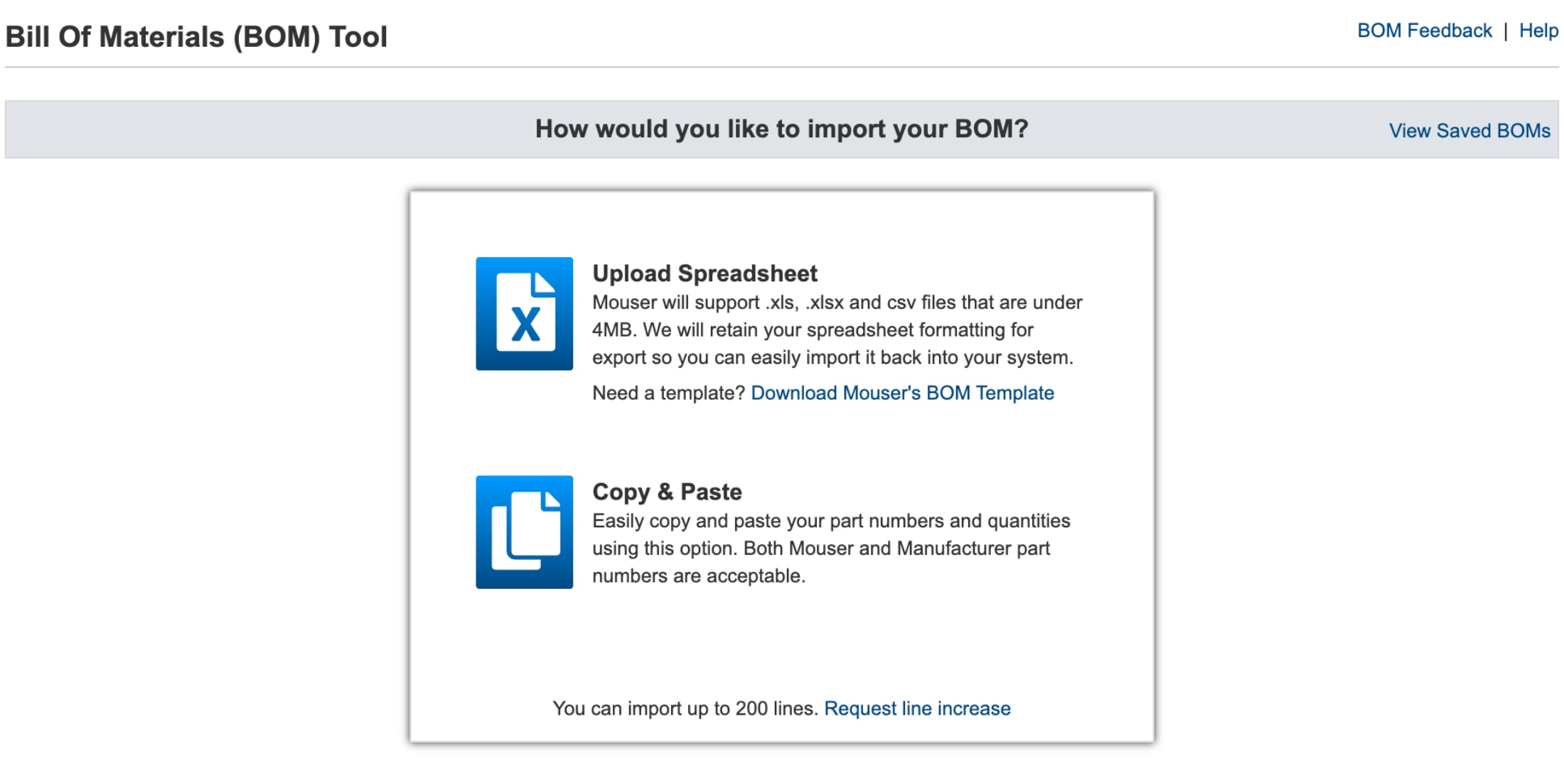 If your BOM is taking a long time to complete, you can safely navigate away from the processing screen while the BOM Tool continues to match your items. When you are ready to return to your BOM, it can be found on the Saved BOMs page.