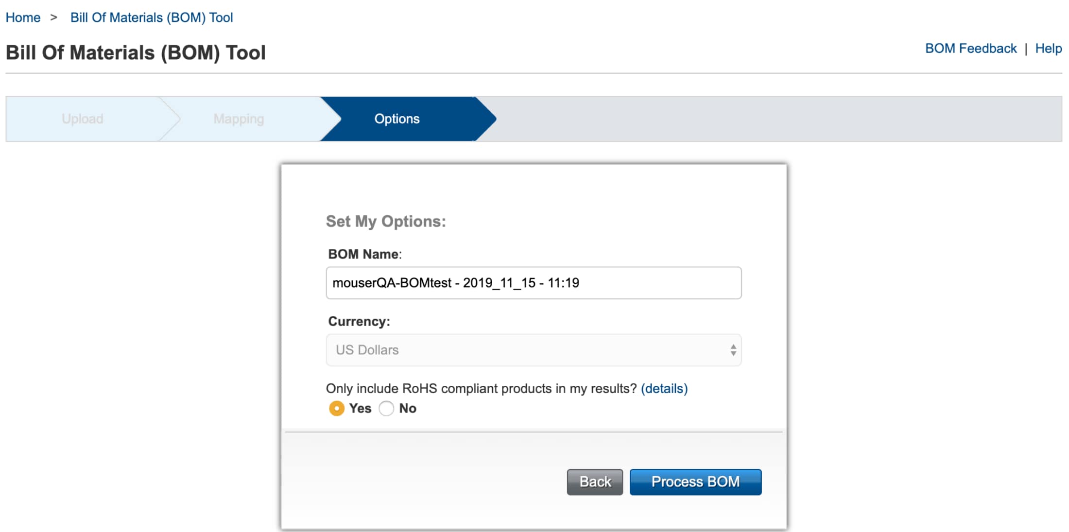 Once your options are finalised, Mouser's BOM Tool will begin matching the items in your BOM. The processing time may range from a few moments to several minutes based on the size of your BOM.