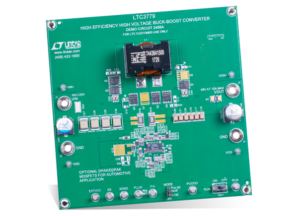 Analog Devices DC2456A Demonstration Board helps designers evaluate the performance of the LTC3779 4-Switch Buck-Boost Controller. The demonstration board features Demonstration Circuit 2456A and the LTC3779EFE 4-Switch Buck-Boost Controller. Demonstration Circuit 2456A is a high-voltage, high-efficiency synchronous buck-boost DC-DC converter with a 16V to 120V input voltage range. Analog Devices DC2456A can supply a 10A maximum load current with a 48V output. The constant frequency current-mode architecture allows a phase-lockable frequency of up to 600kHz. An optional output current feedback loop supports applications such as battery charging. With a wide input range, wide output range, and seamless transfers between operation modes, the LTC3779 is ideal for industrial, automotive, medical, military, and avionics applications.Features