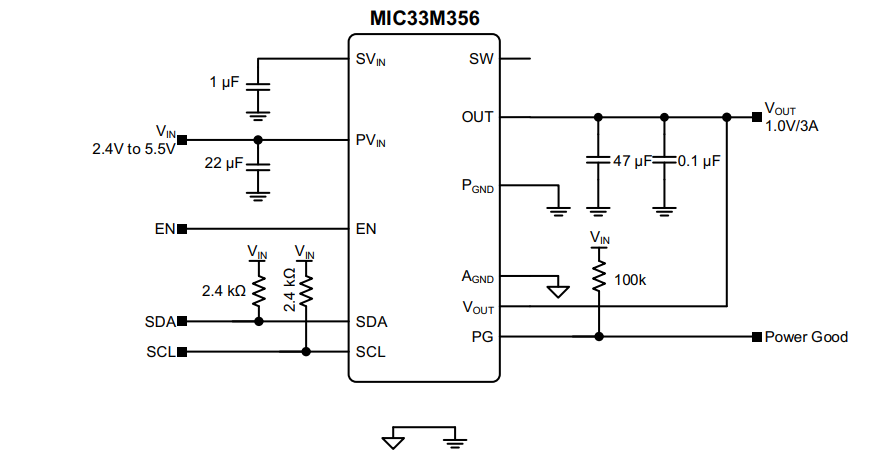 The MIC33M356 I2C interface allows programming the output voltage between 0.6V and 1.28V, with 5mV resolution (-HAYMP and -FAYMP) or between 0.6V and 3.84V, with 10mV and 20mV resolution (-SAYMP). Two different default voltage options (0.9V and 1.0V) are provided so that the application can be started with a safe voltage level and then moved to high-performance modes under I2C control.